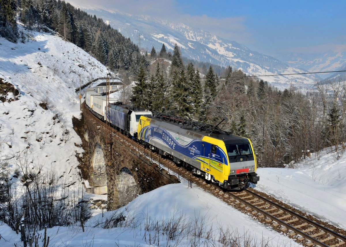 189 912 + 185 662 mit einem Ekol-KLV am 23.02.2013 auf dem Schlossbach Viadukt bei Bad Hofgastein.