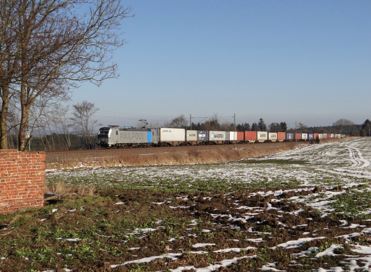 193 801 zu sehen mit einem Container am 12.02.15 an der Schöpsdrehe bei Plauen/V.