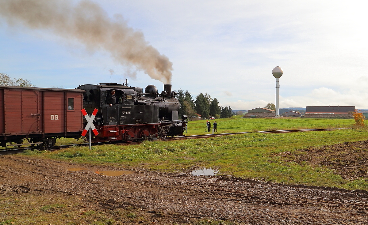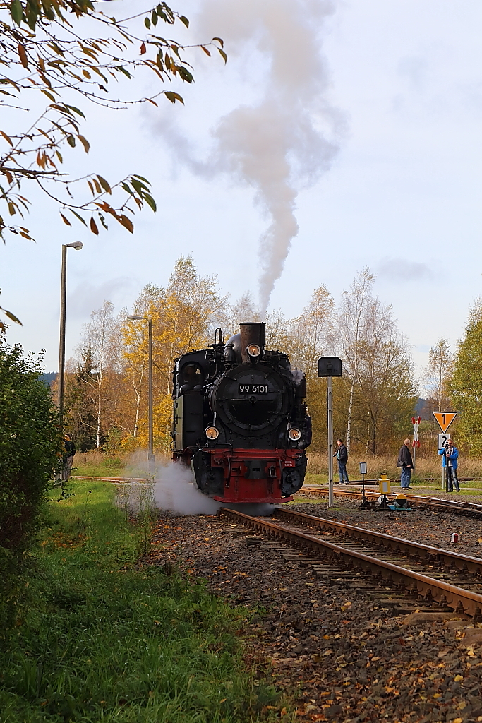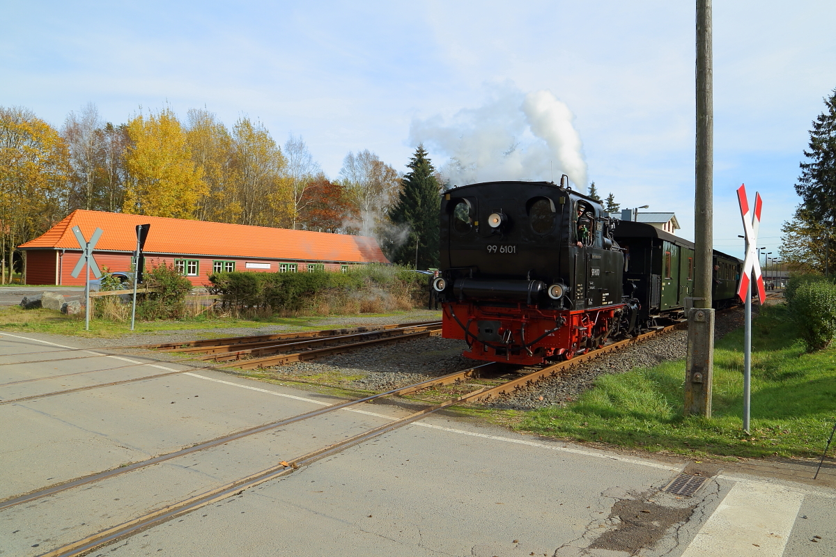 99 6101 mit IG HSB-Sonderzug am Nachmittag des 18.10.2014 beim Überqueren des Bahnüberganges am Bahnhof Stiege.