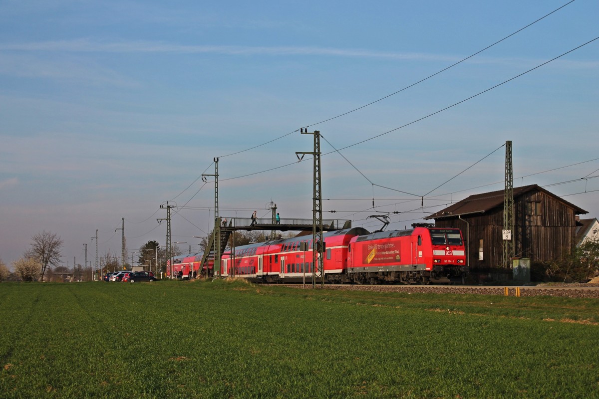Ausfahrt am 29.03.2014 von der Freiburger 146 114-4 "Baden-Württemberg erfahren" mit einem RE aus Offenburg nach Basel Bad Bf in Auggen.