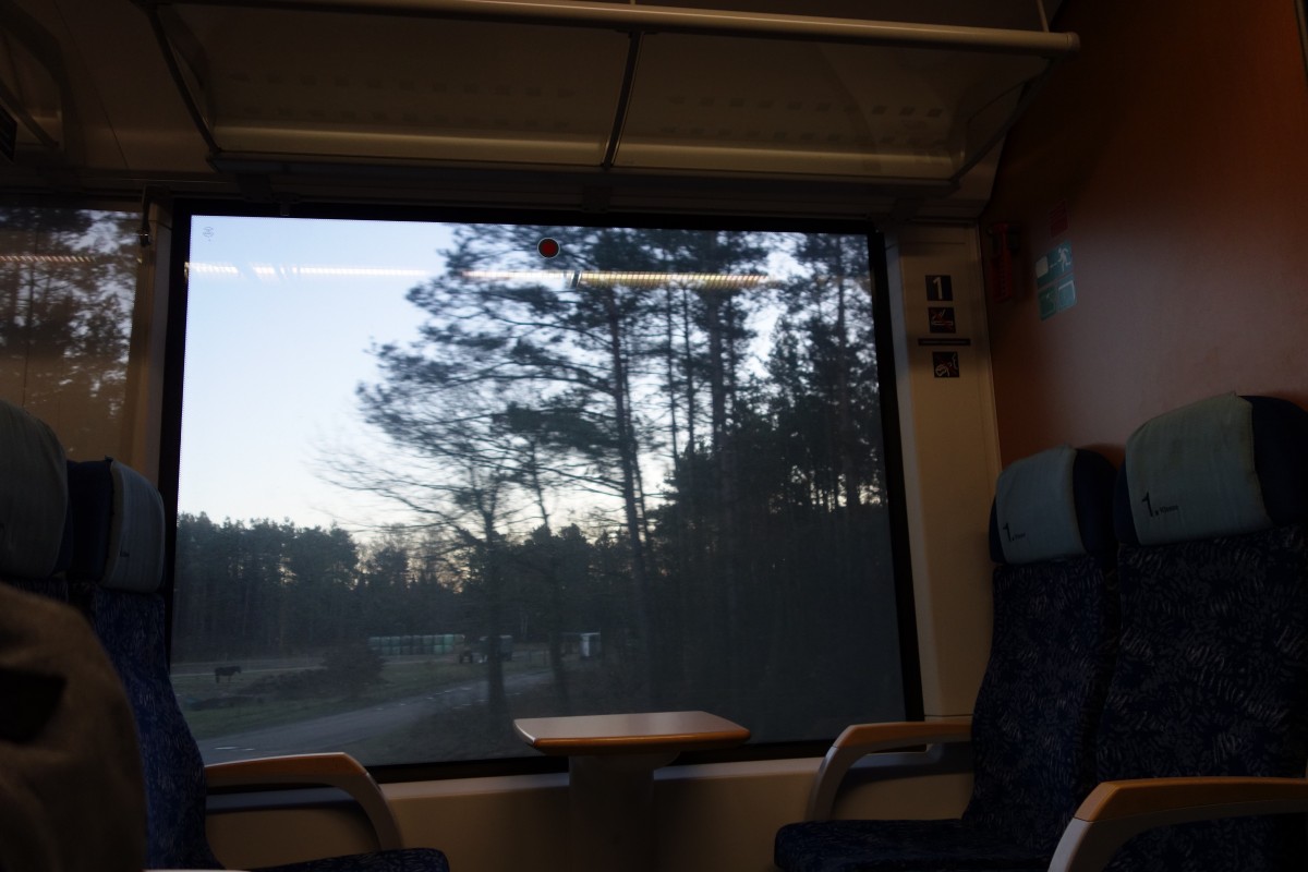Blick aus der 1.Klasse des erx 82889 nach Hannover Hbf in die Landschaft der Lüneburger Heide. Dies wird in dieser Form durch die großen Fenster, die in der BR 648 verbaut sind, möglich. Februar 2015.