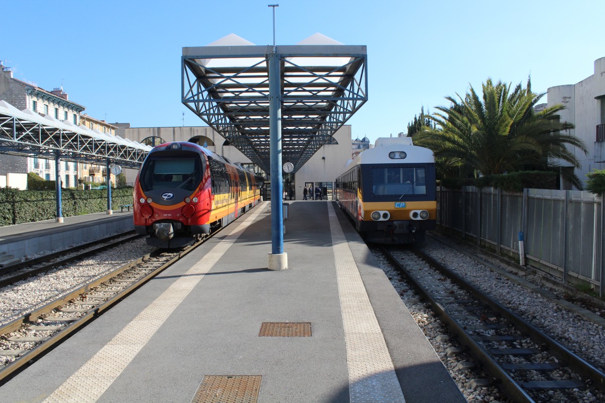 Chemins de fer de Provence: Im Bahnhof Nice CP stehen am 11. Februar 2015 die beiden Triebzüge AMP 804 und X 351.