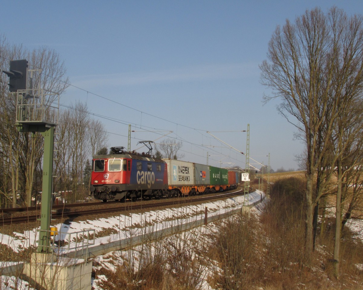 Containerzug vom 07.02.2015 mit 421 375-7 auf Weg nach Hof. Hier passierte er den Ort Jocketa/Pöhl.