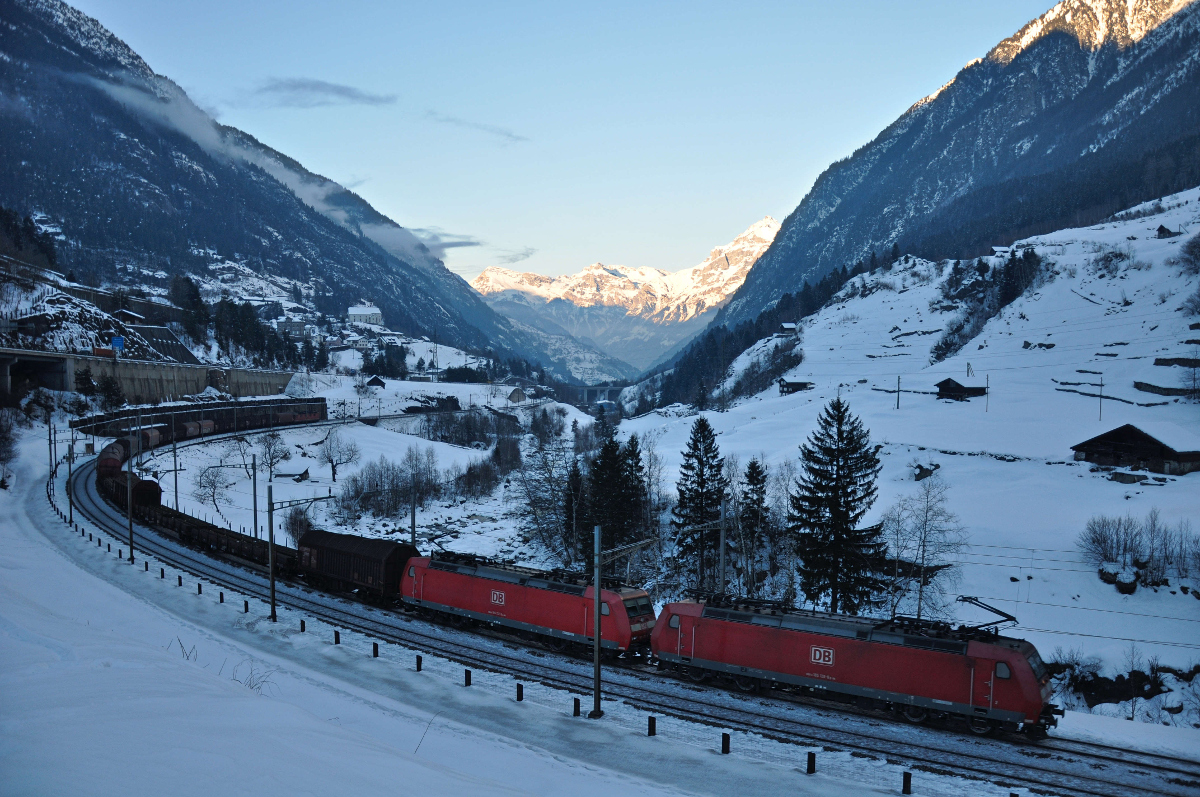 Die beiden 185 128-6 und 185 132-8 unterwegs auf der untersten Ebene in Wassen Richtung Süden. Überraschenderweise leistete die Prototyp Re 6/6 11601 den beiden DB Loks und ihrem Güterzug Unterstützung als Schublok. Aufgenommen am 10.02.2015