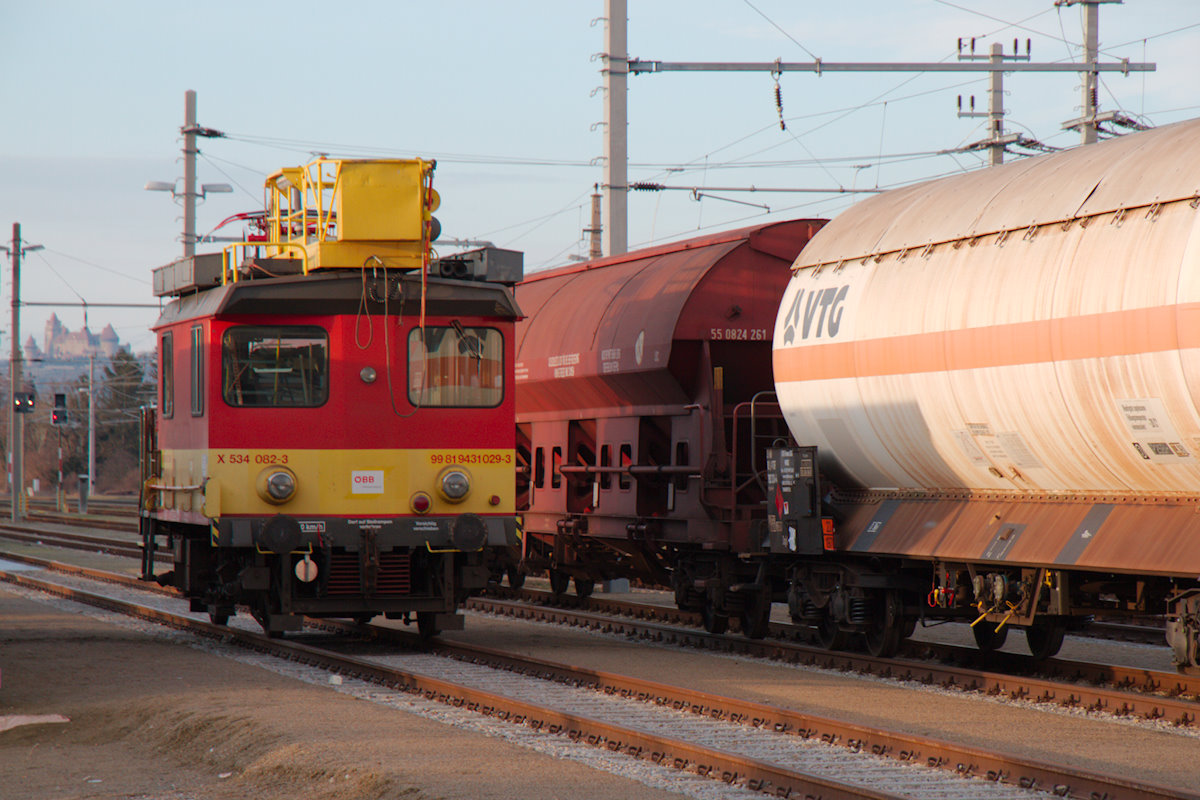 Dort wo gerade der neue Zugang zu den Bahnsteigen des Korneuburger Bahnhofs entsteht, war am 01.02.2015 der X 534 082 abgestellt. Im Hintergrund links vom Triebwagen ist die Burg Kreuzenstein zu erkennen.