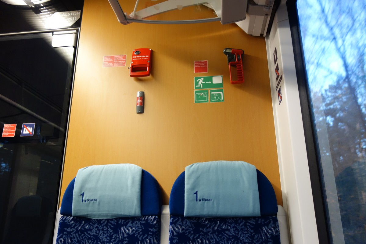 Durch das kleine 1.Klasse-Abteil in den LINT 41-Zügen des erixx schaut man auf vier von acht Plätzen stets gegen diese Wand. Auch dort angebracht sind der Haltewunschtaster, die Notbremse und der Nothammer. Februar 2015.