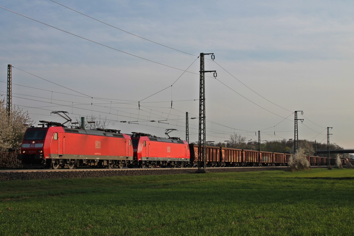 Durchfahrt am späten Nachmittag des 29.03.2014 von 185 123-7 zusammen mit 185 127-8 und einem schweren gemischten Güterzug in der Ortschafft Auggen gen Norden.