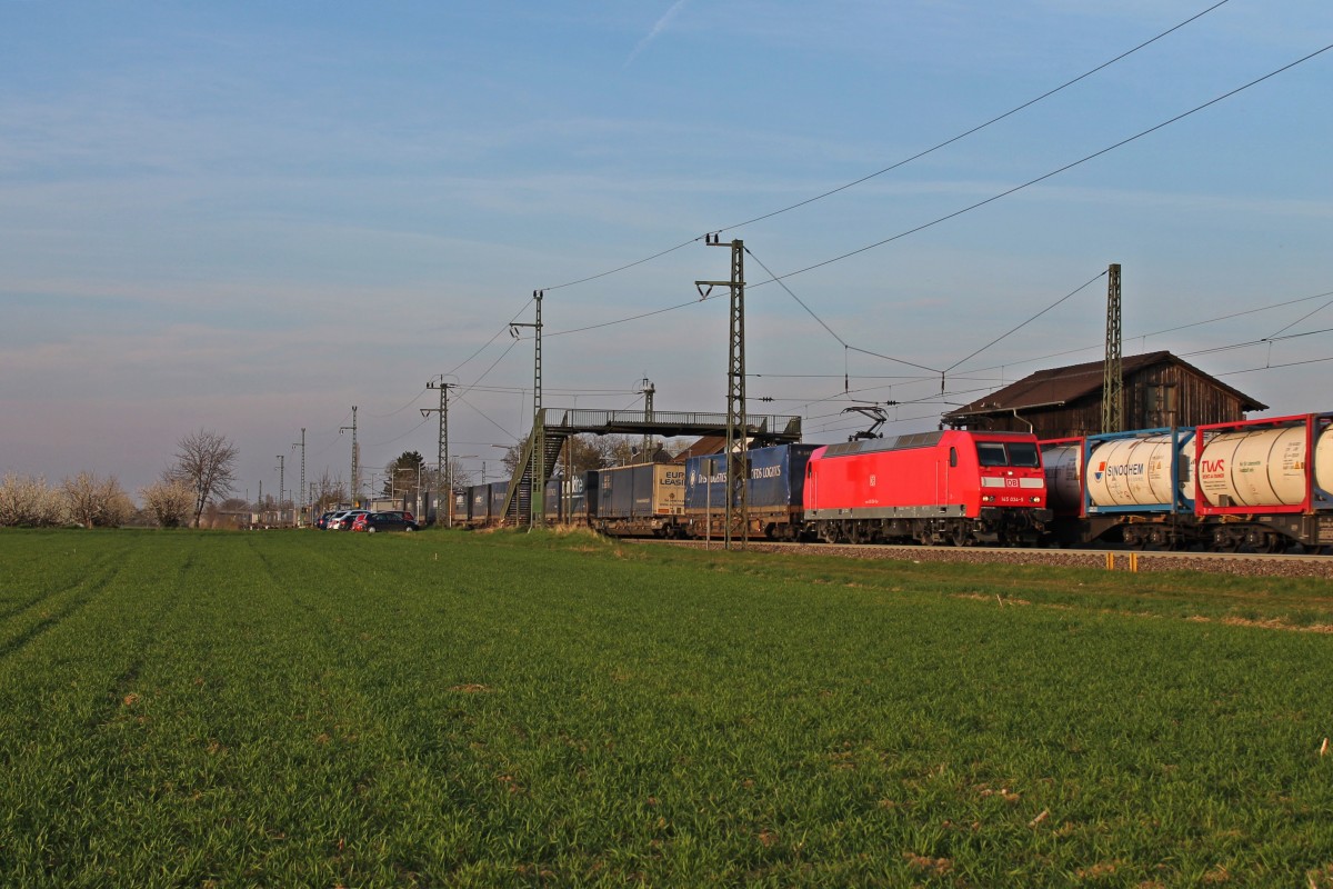 Entgegen der 482 028-8 fuhr von DB Schenker die 145 034-5 und ebenfalls mit einem langen Containerzug gleichzeitig durch den Hp von Auggen, aber in Fahrtrichtung Süden. (29.03.2014)