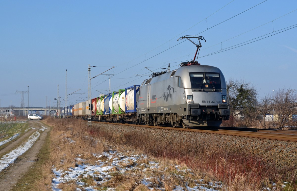 ES 64 U2 - 102 zog am 07.02.15 den Bertschizug von Buna nach Ruhleben durch Delitzsch.