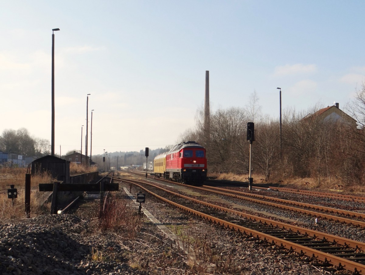 MEG 318 (232 690) fuhr am 11.02.15 mit einem Messzug von Zeitz nach Vojtanov und zurück. Hier zu sehen in Plauen/V. unterer Bahnhof bei der Rückfahrt.