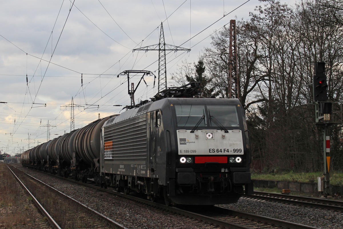 MRCE Dispolok/Locon ES 64 F4-999 (189 099) am 4.3.14 mit einem Kesselzug in Ratingen-Lintorf.