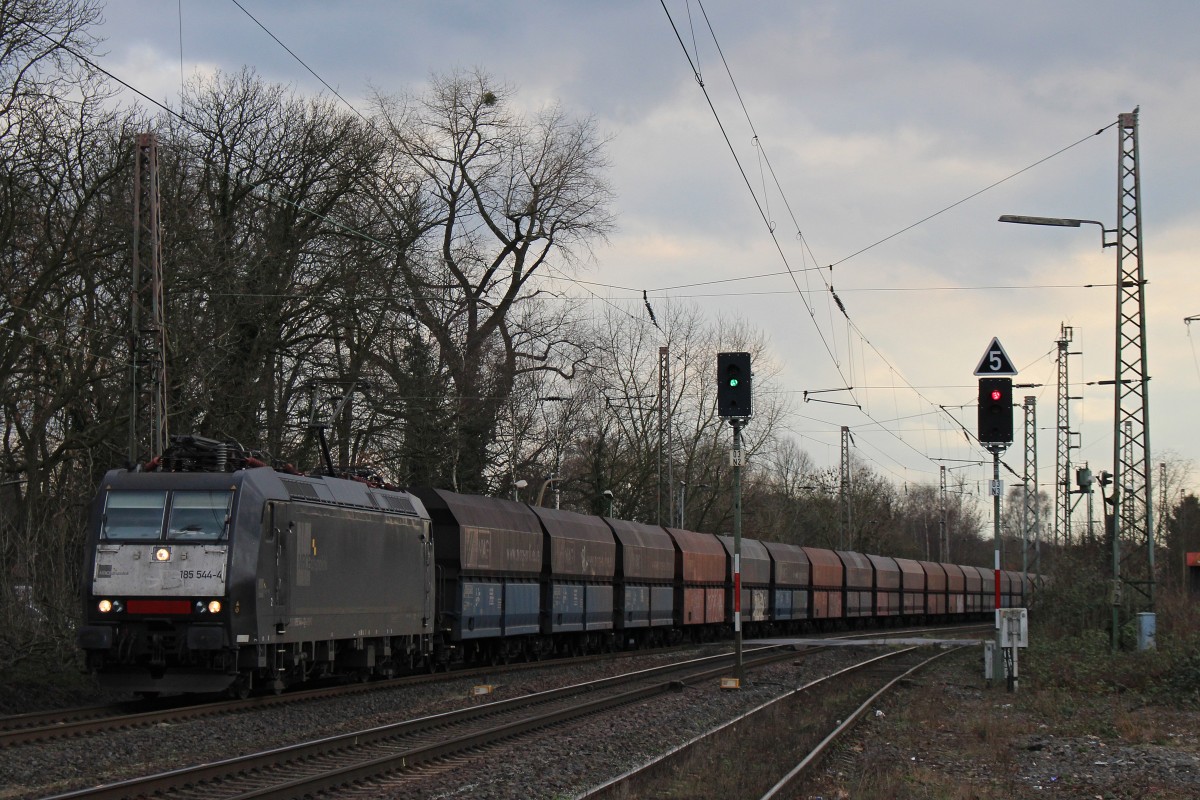 MRCE/NIAG 185 544 am 4.3.14 mit einem leeren Kohlewagenzug nach Moers Gbf in Ratingen-Lintorf.