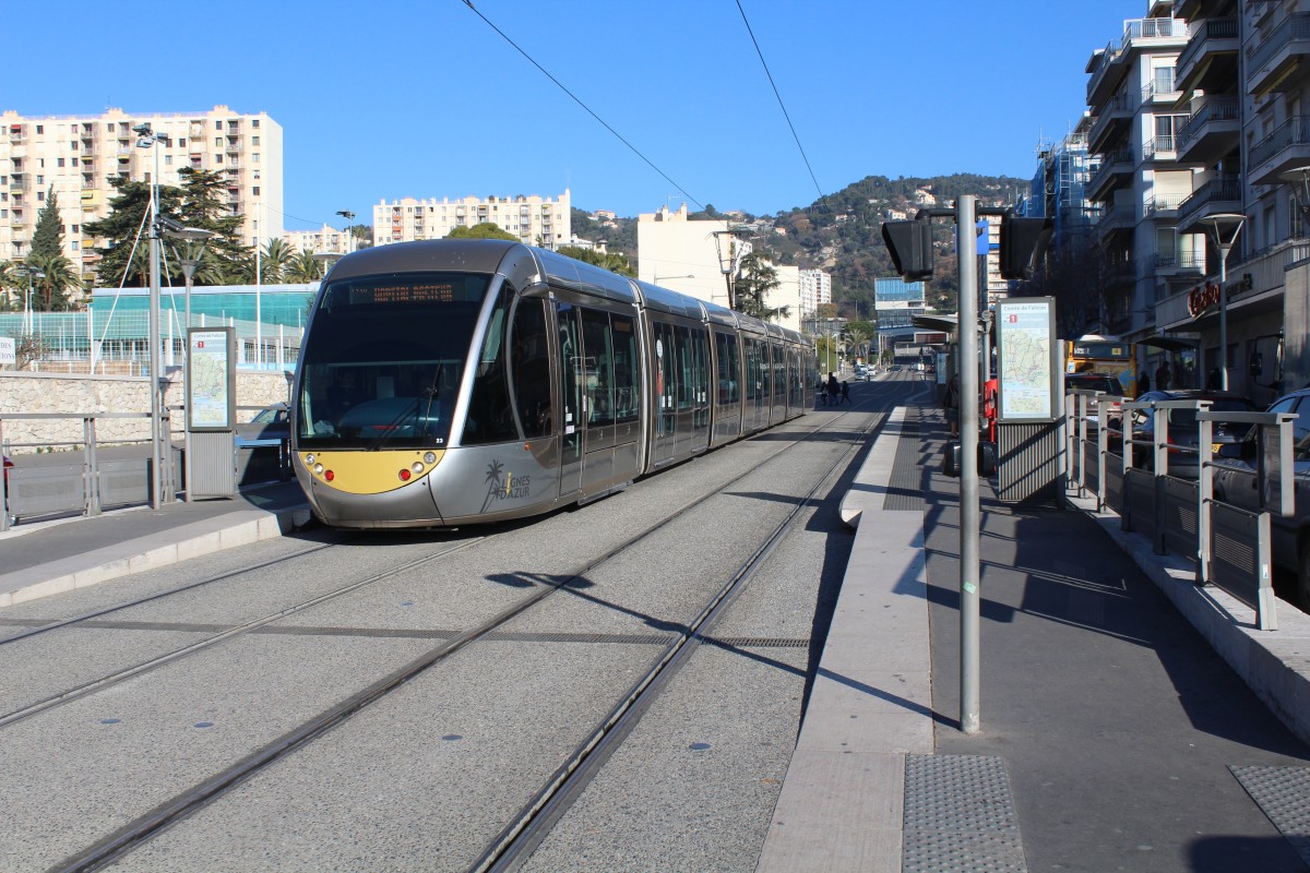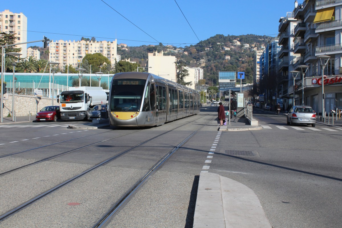 Nice / Nizza Lignes d'Azur SL T1 (Alstom Citadis-302 11) Boulevard de Gorbella am 11. Februar 2015.