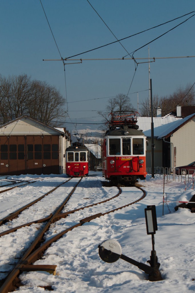 Noch ein Foto des Bahnhofs Attersee - links der zweiständige Lokschuppen, rechts das Bahnhofsgebäude. Zu sehen sind der abfahrtbereite Triebwagen 26 109 im Hintergrund und der Triebwagen 26 111 im Vordergrund. (07.02.2015)