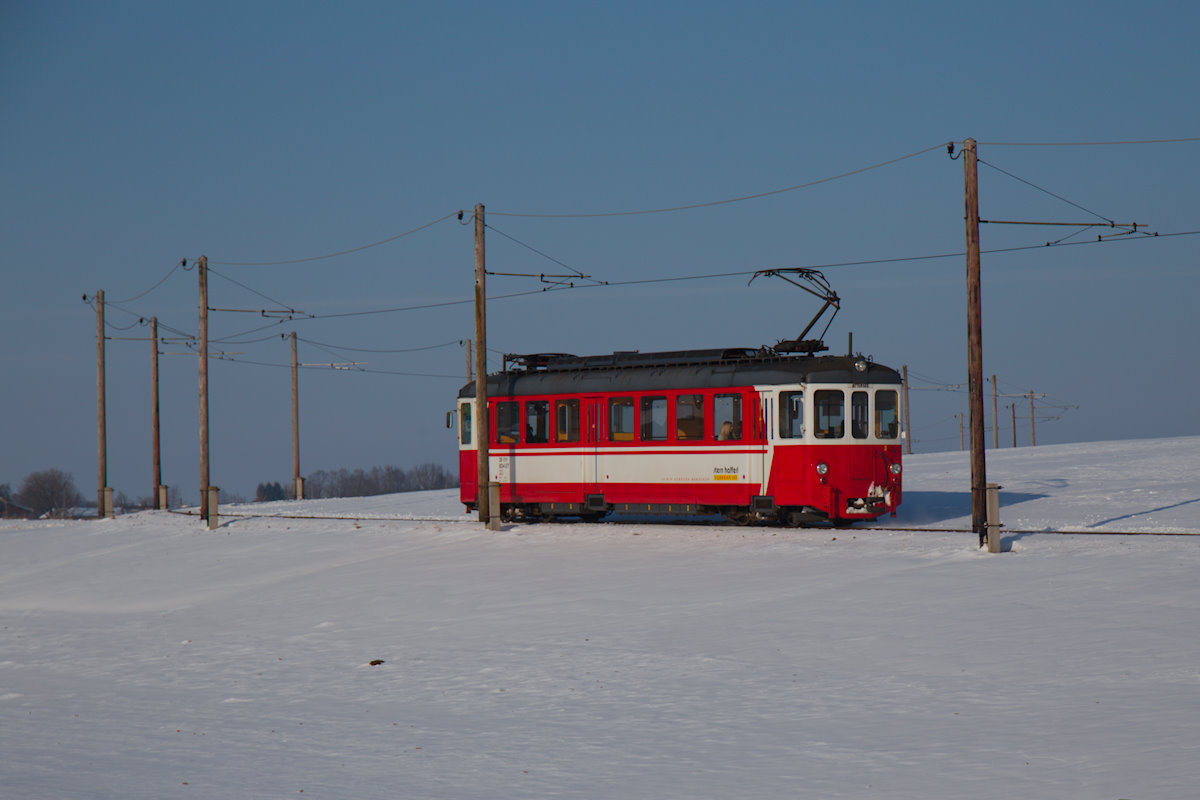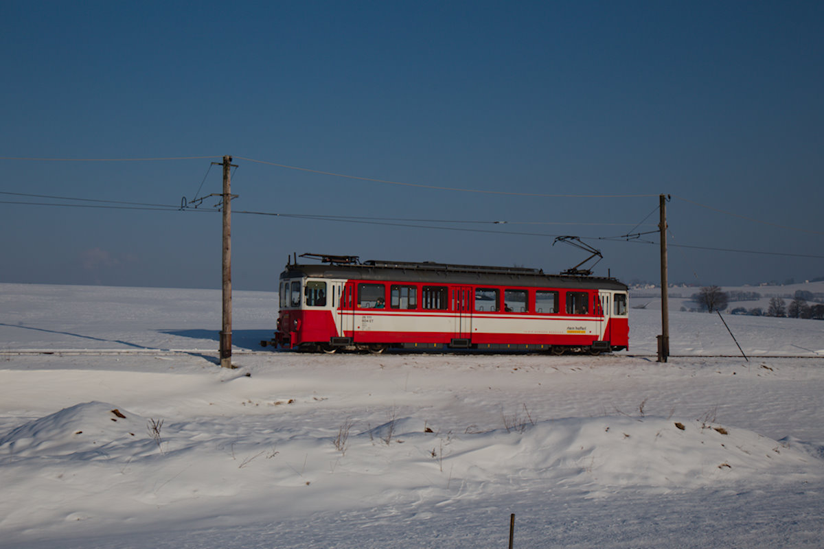 Seitenansicht des Triebwagen 26 111 auf der Fahrt von Attersee nach Vöcklamarkt, aufgenommen kurz bevor er an der Haltestelle Hipping vorbeifahren wird. (07.02.2015)