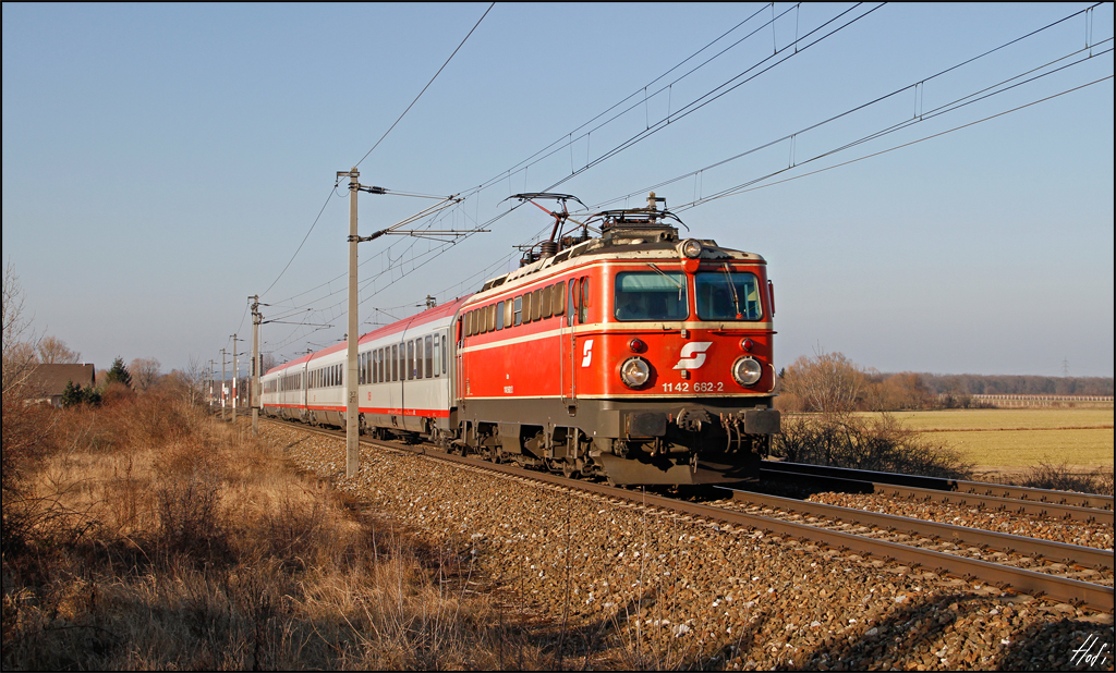 1142.682 mit einem der vier Freitags verkehrenden Entlastungszüge Wien Hbf-Wr.Neustadt-Wien Hbf. Der D15075 (Wien Hbf-Wr.Neustadt) wurde von mir am 13.02.15 kurz vor der Hst. Sollenau aufgenommen.
