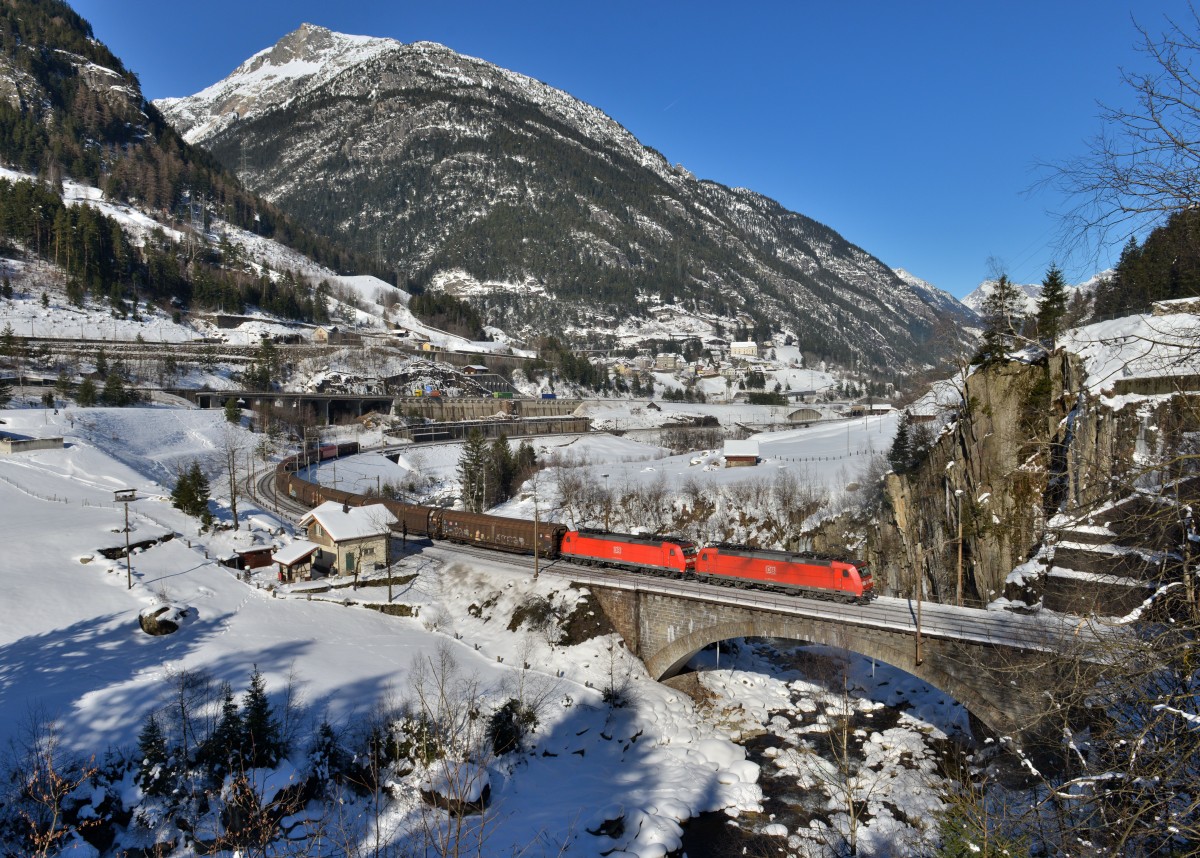 185 116 + 185 136 mit einem Güterzug am 11.02.2015 bei Wassen.