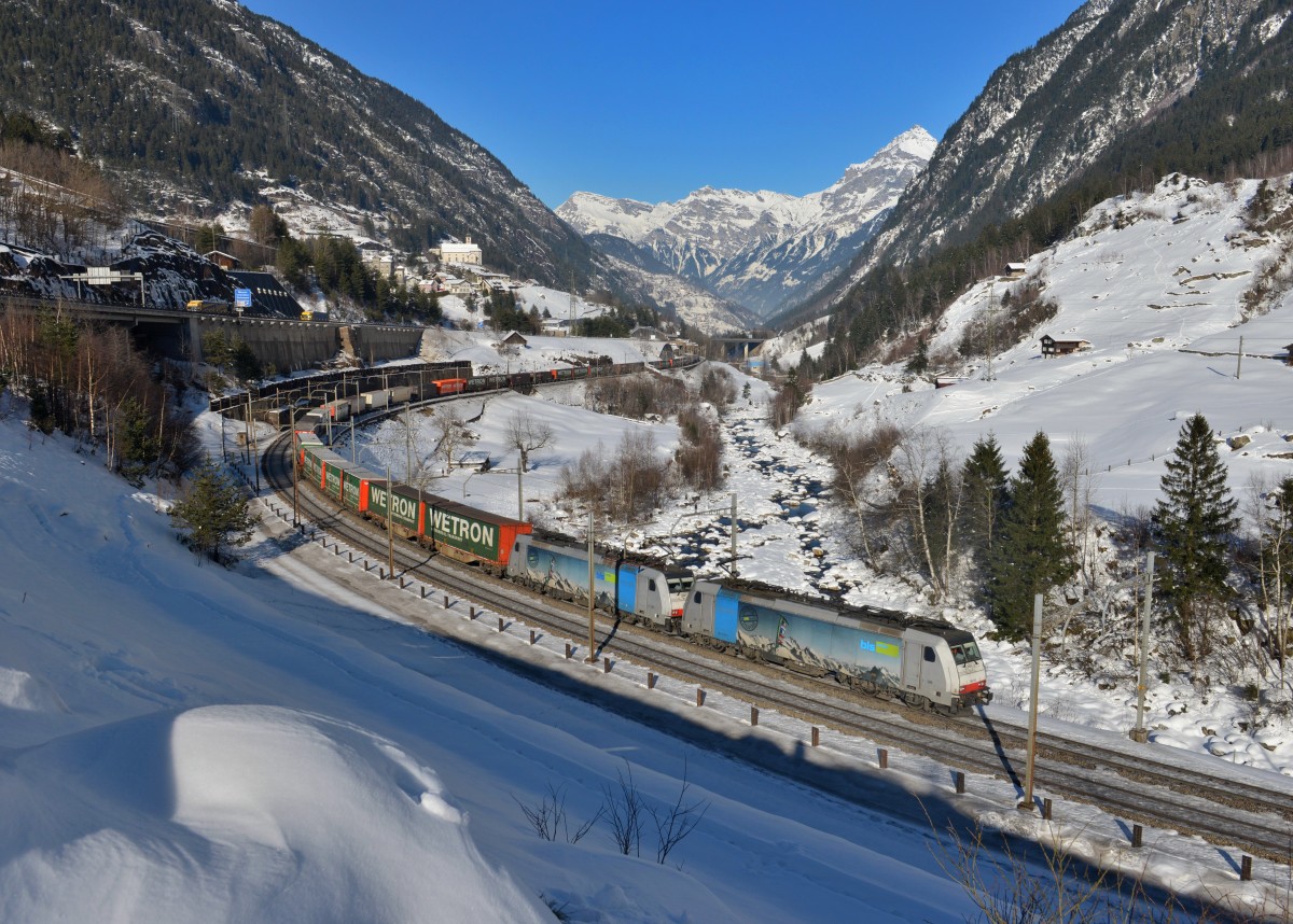 186 105 + 186 109 mit einem KLV am 11.02.2015 bei Wassen.