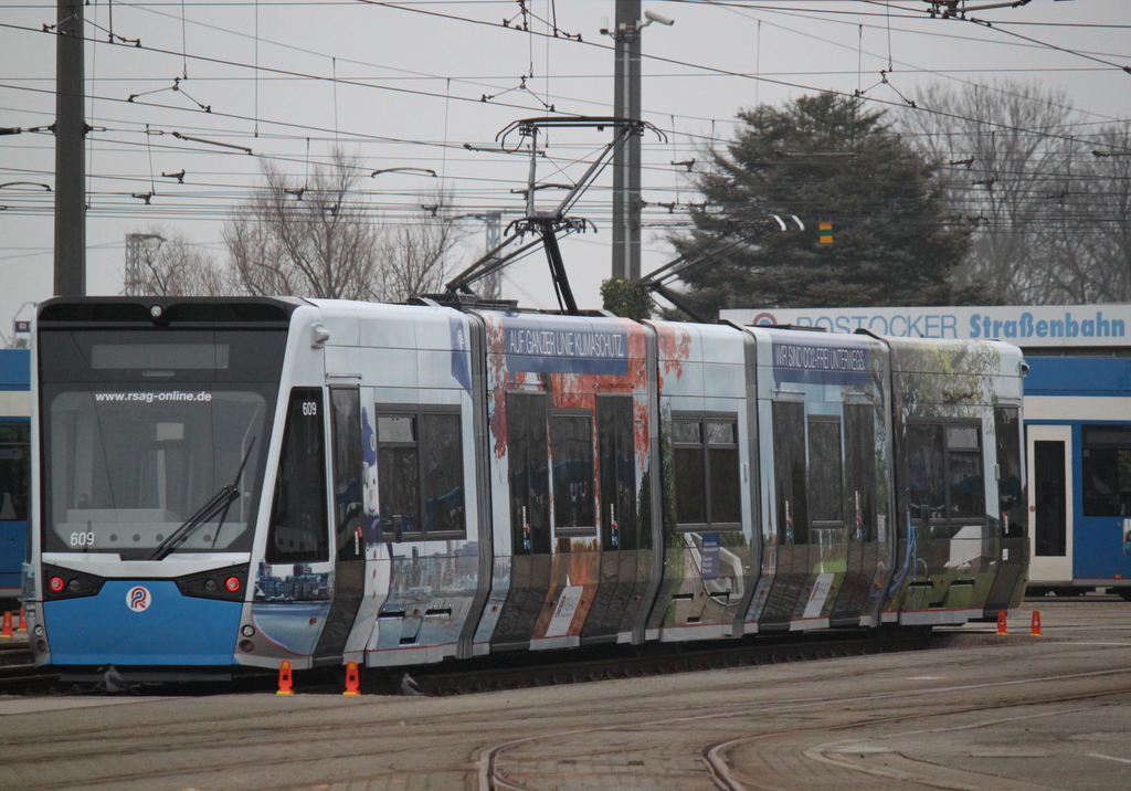 6N2 Wagen 609 mit Klimar-Werbung stand am 13.02.2015 auf dem Gelände der Rostocker Straßenbahn AG.