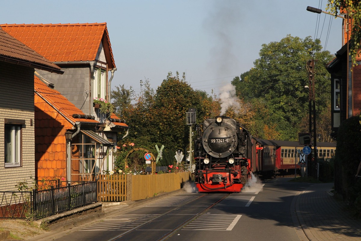 99 7241-5 (Baujahr: 1956) der Harzer Schmalspurbahn GmbH (HSB) mit Lokzalzug 8939 Wernigerode-Brocken in Wernigerode Kirchstraße am 4-10-2014.