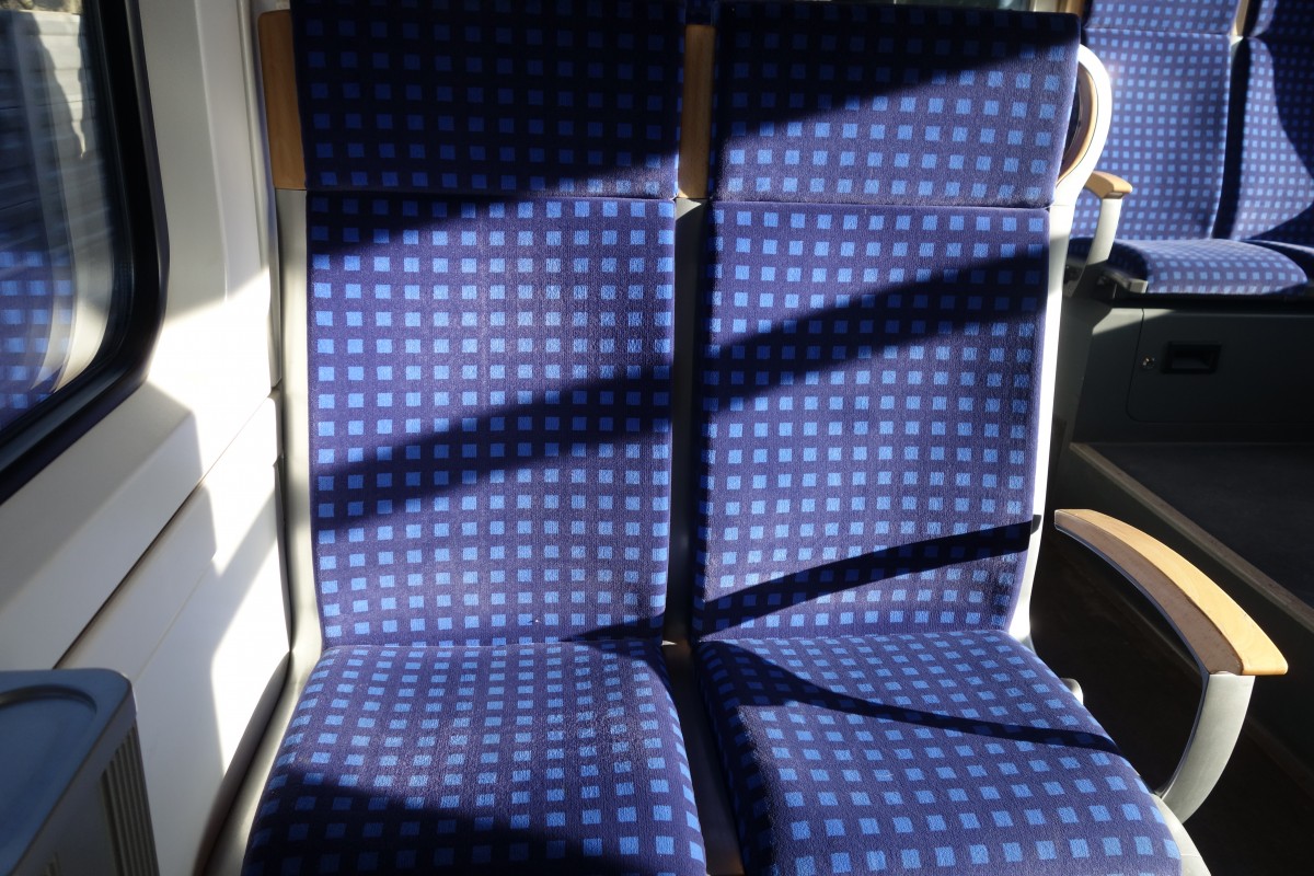Blick auf eine Zweiersitzgruppe der 1.Klasse in der S-Bahn Hannover (BR 425 auf der Linie S4 nach Hannover Hbf). Februar 2015.