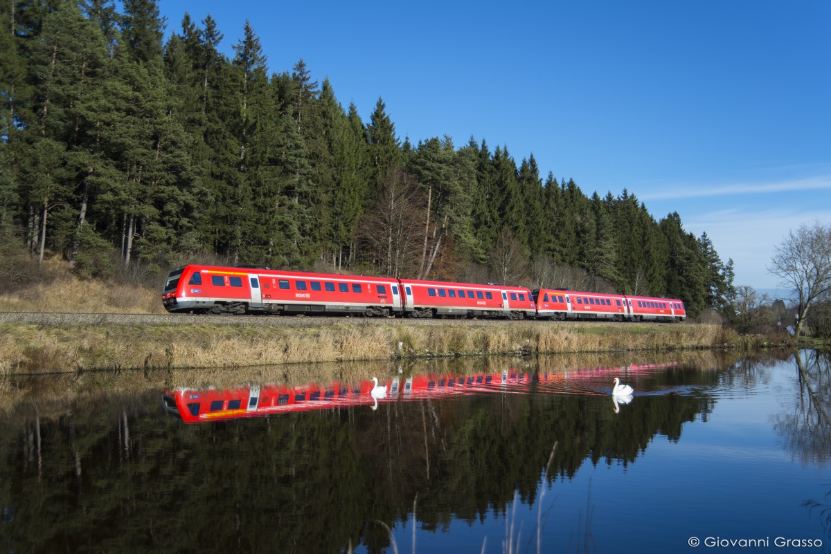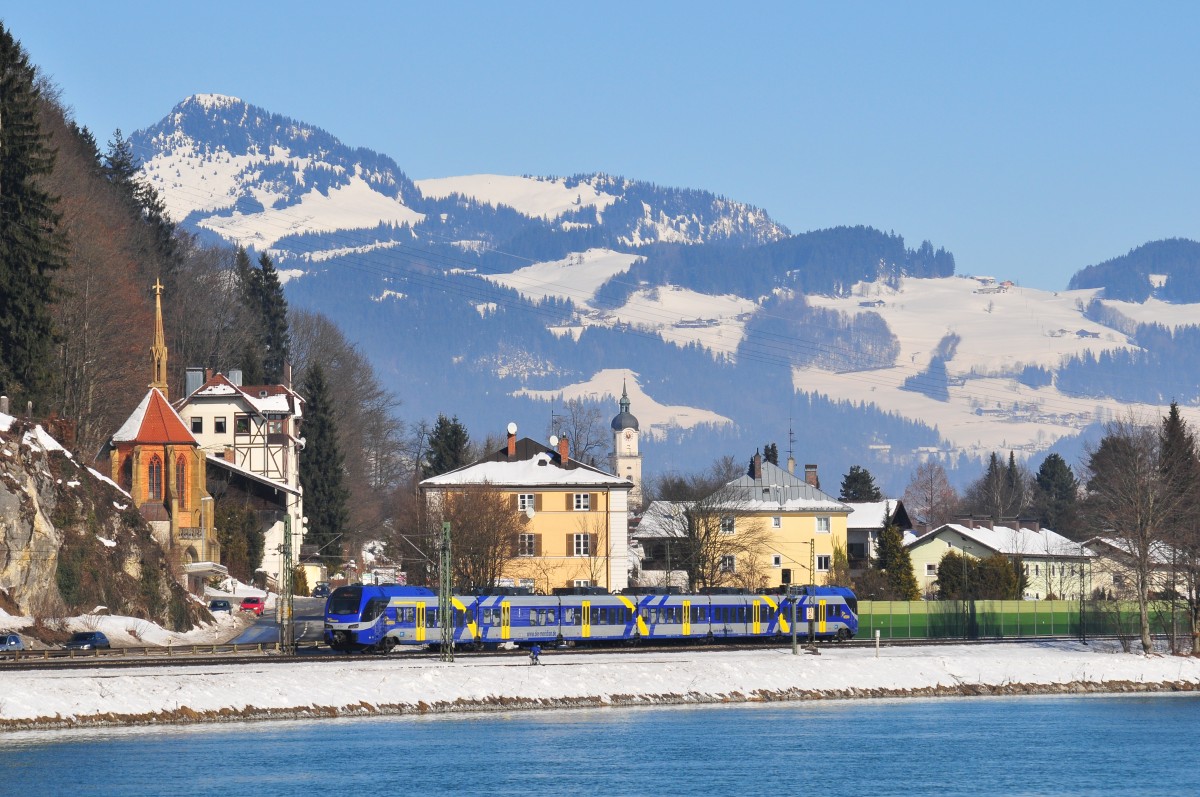 Ein Meridian ET 306 Triebzug am 12.02.15 bei Kiefersfelden kurz vor Kufstein am grünen Inn.