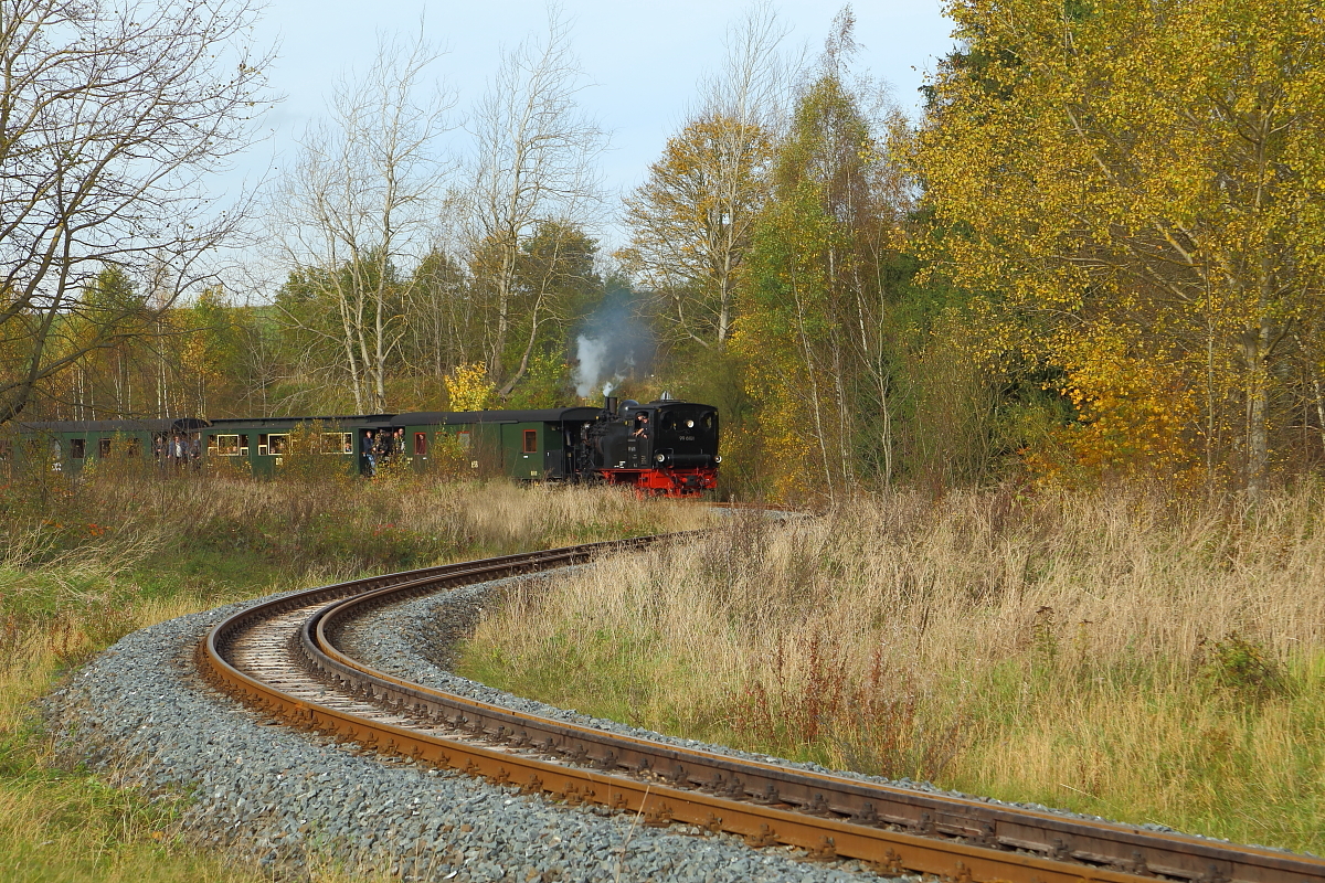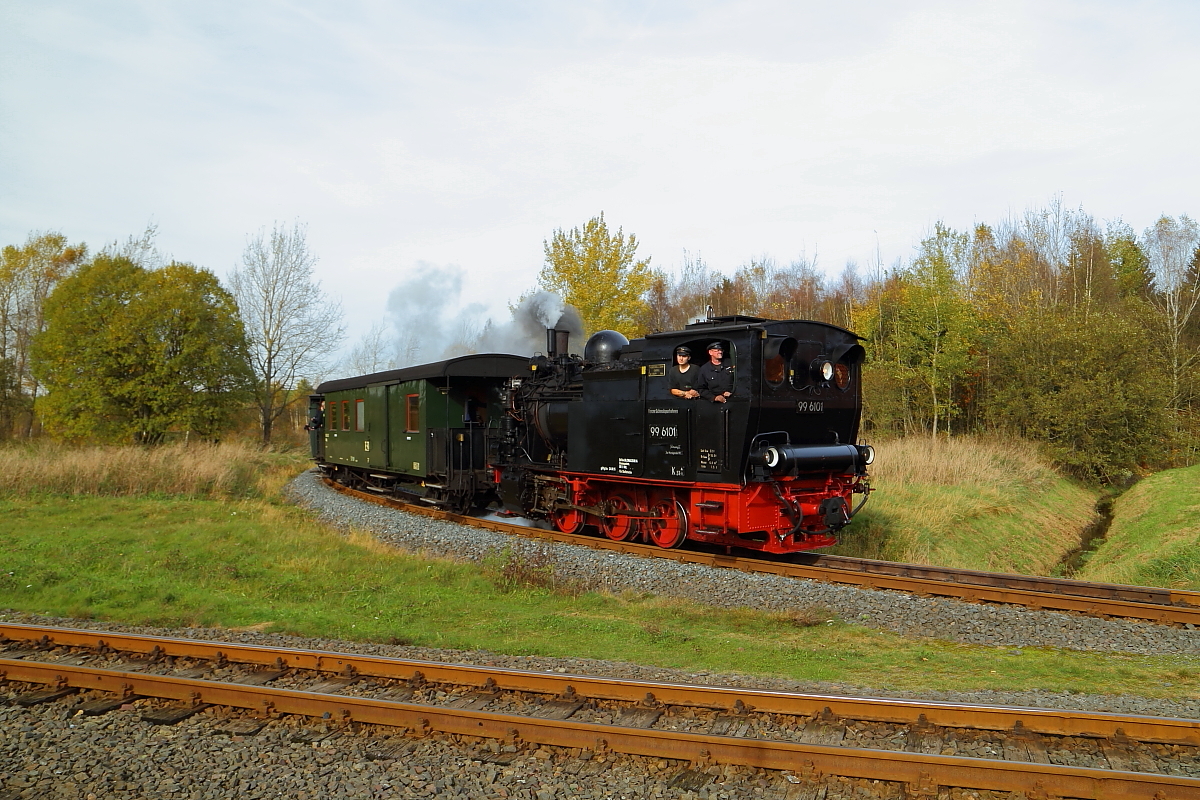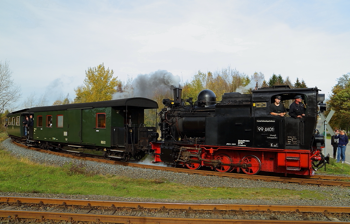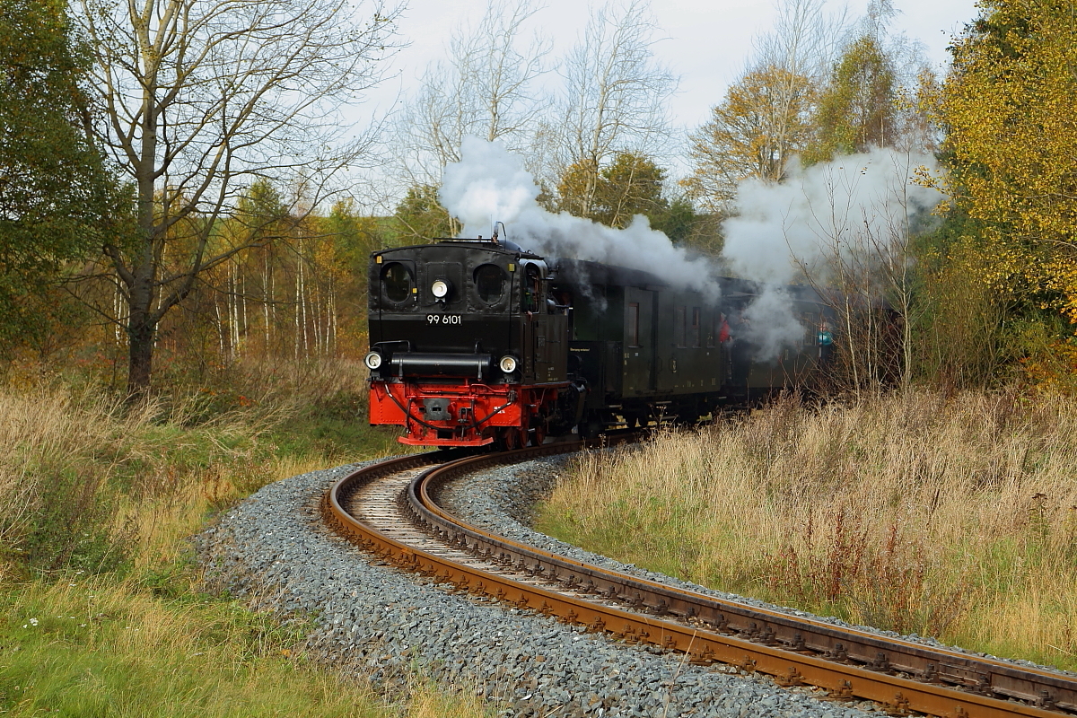 Fahrt von 99 6101 mit IG HSB-Sonderzug am 18.10.2014 durch die Wendeschleife am Bahnhof Stiege. Bemerkenswert ist, dass die Fahrt ausnahmsweise mal im Uhrzeigersinn stattfand, denn normalerweise geht es genau anders herum! (Bild 1)