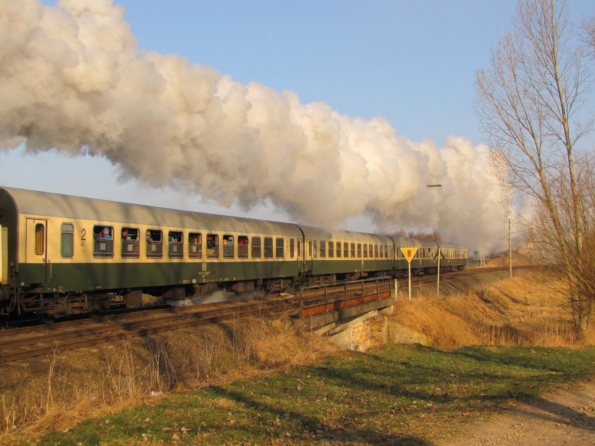 Jeden Samstag und Sonntag vom 24.01. bis 14.02.2015 verkehrt der "Rodelblitz" von Erfurt Hbf nach Meiningen. Zum Einsatz kommen dabei Wagen des Thüringer Traditionszuges. Hier der RE 16272 "Rodelblitz" am 07.02.2015 bei Sülzenbrücken.