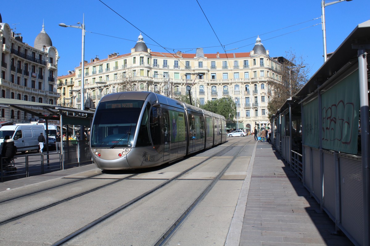 Nice / Nizza Lignes d'Azur SL T1 (Alstom Citadis-302 03) Place de la Gare du Sud am 11. Februar 2015.
