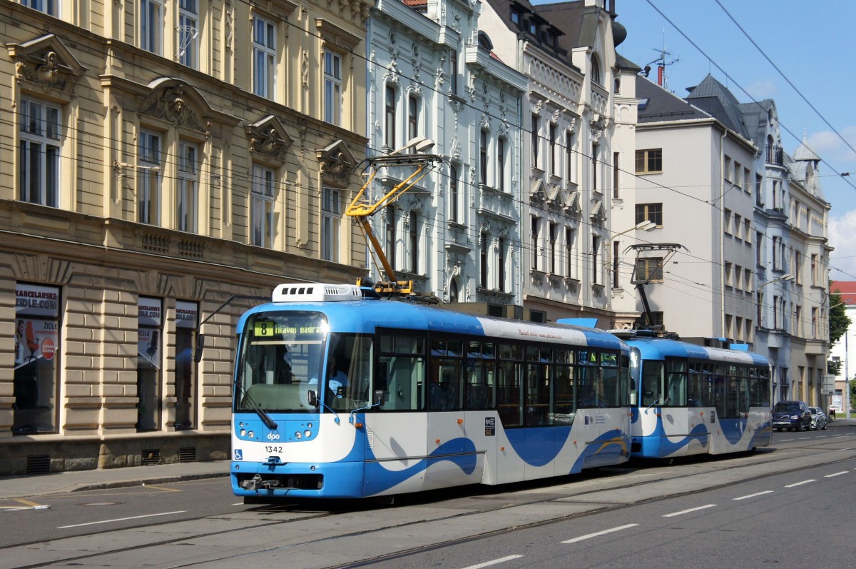 Tschechische Republik / Straßenbahn Ostrava: Vario LFR.E - Wagennummer 1342 sowie ein weiterer Vario LFR.E ...aufgenommen im Juni 2014 in der Nähe vom Bahnhof (Straßenname: Nádražní) von Ostrava.