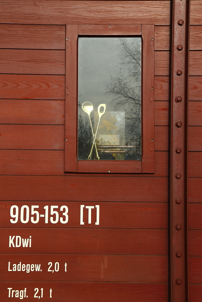 Wenn man in das Fenster dieses Schmalspurgüterwagens der Interessengemeinschaft Harzer Schmalspurbahnen (IG HSB) blickt, wird einem sehr schnell klar, warum dieser Waggon auch "Suppenwagen" genannt wird! ;-) Er wird vom Verein bevorzugt in dessen Sonderzügen eingesetzt, um für das leibliche Wohl von Fahrgästen und Zugpersonal zu sorgen. Die Aufnahme entstand am 18.10.2014 im Bahnhof Stiege, wo er ebenfalls in einen Sonderzug eingestellt war.