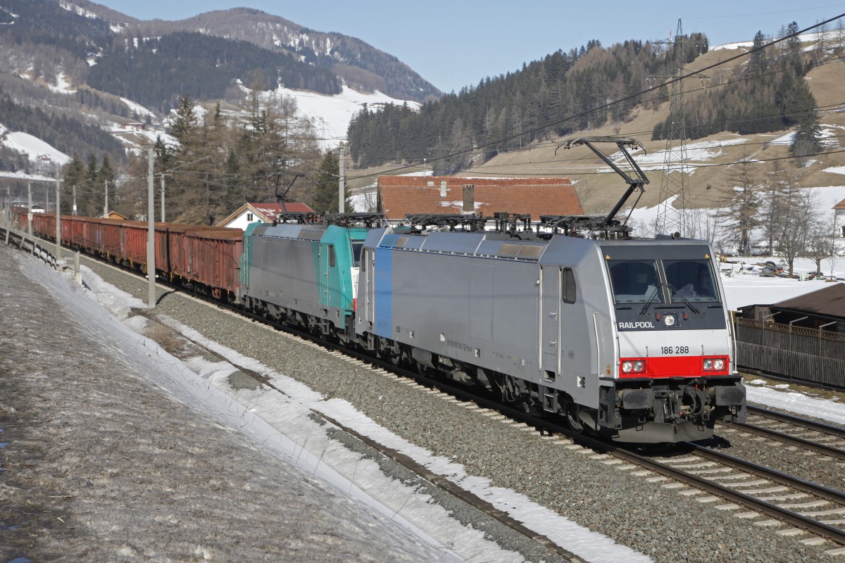 186 288 + 186 247 mit Güterzug bei Steinach in Tirol am 13.02.2015.