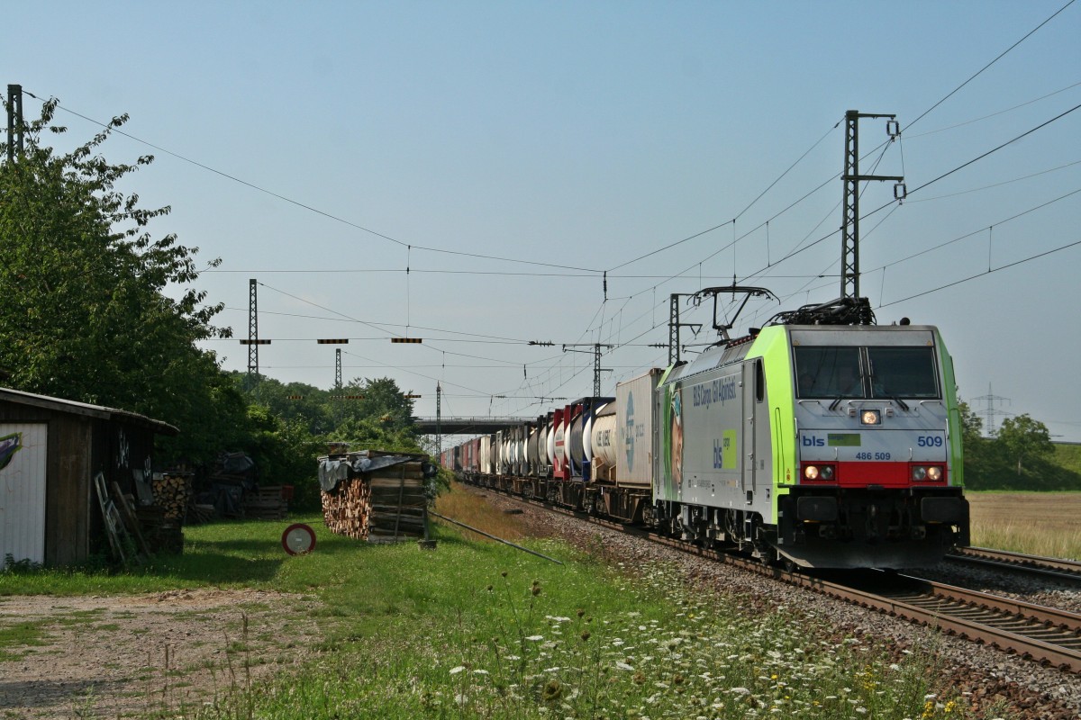 486 509 mit dem 42014 von Gallerate nach Wanne-Eickel am Morgen des 01.08.14 südlich von Auggen.