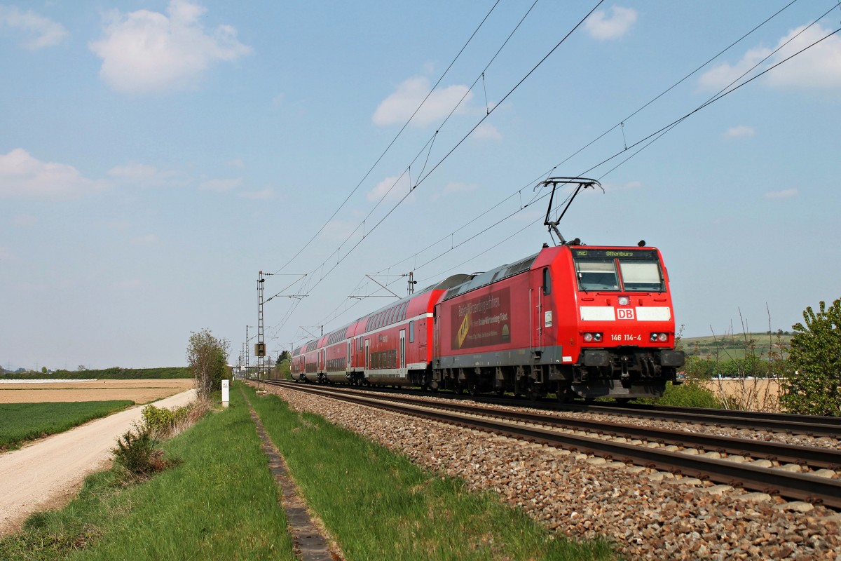 Am Mittag des 13.04.2014 schob die Freiburger 146 114-4 "Baden-Württemberg erfahren" einen RegionalExpress von der Schweizer Grenze nach Offenburg. Hier ist sie kurz hinter ihrem letzten Halt in Müllheim (Baden).