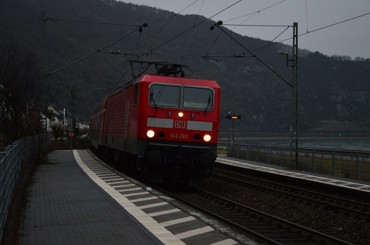 An Abend des 17.Feb.2015 kommt die 143 263 mit einem RE2 durch Hirzenach nach Frankfurt Hbf.