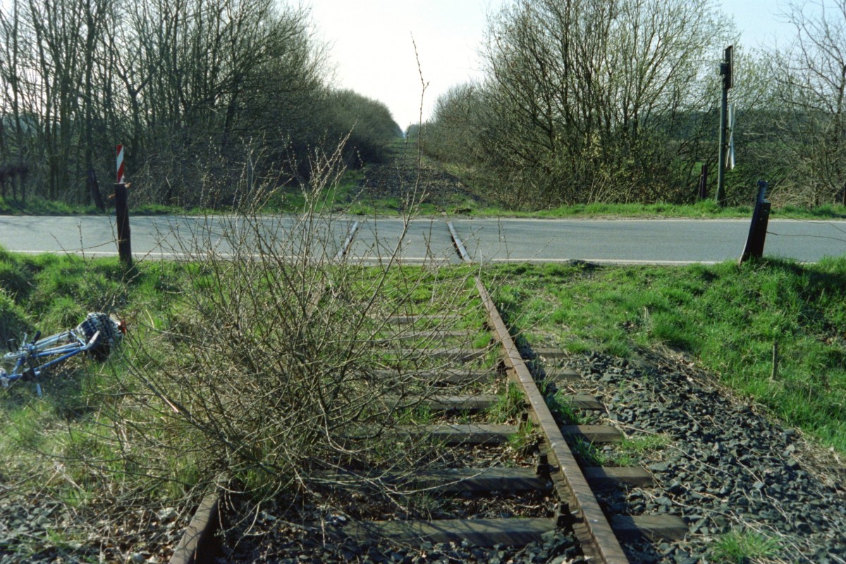 Die Strecke Lüneburg–Buchholz (Nordheide) am 14.04.1995 zwischen Brackel und Marxen; der Personenverkehr endete am 26.09.1981, die Stilllegung des hier gezeigten Abschnitts (Mechtersen–Marxen) erfolgte zum 01.05.1989.