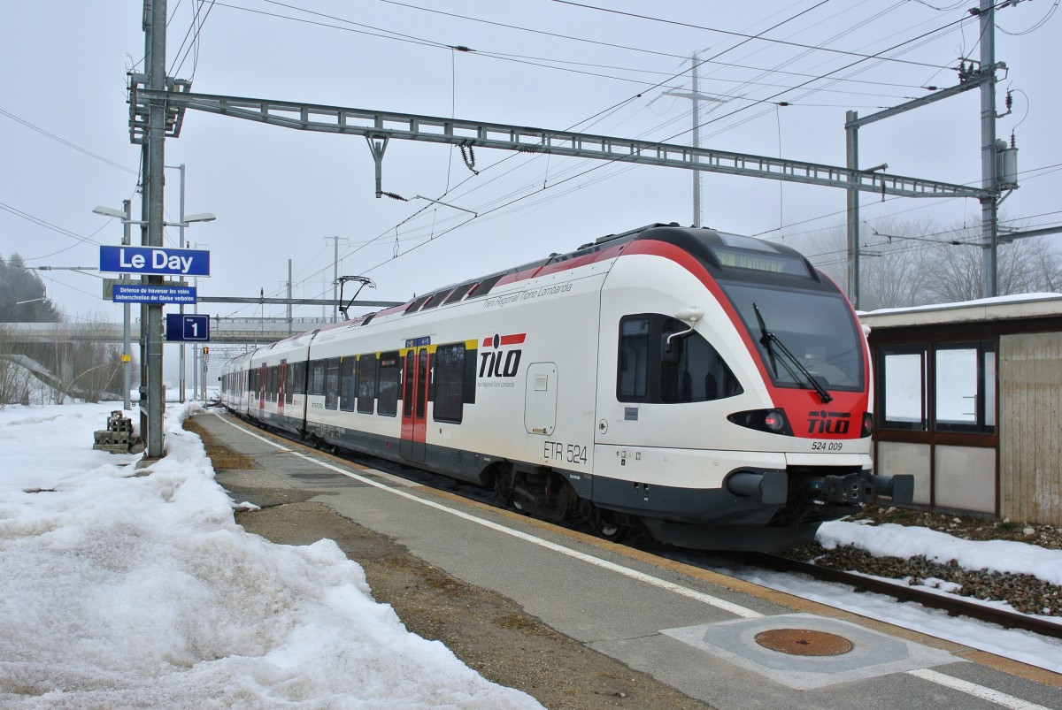 Einst für TILO für den Grenzüberschreitenden Verkehr Schweiz/Italien beschafft verkehrten 3 Züge Jahrelang auf der (ehemaligen) Gleichstromstrecke Genf-La Plaine. Für diesen Einsatz wurden die Züge optisch angepasst und mit dem Unireso Logo versehen. Der Einsatz in der Westschweiz ist nun zu Ende, die Strecke wurde um elektrifiziert, es wurden neure Flirts RABe 522 der Region Basel übernommen. RABe 524 009 im Bild wurde nun wieder mit TILO Anschriften versehen, im Inneren wurden bereits Werbungen auf italienisch und das Streckennetz der S-Bahn Tessin aufgehängt. Aktuell verkehrt der Flirt noch in der Westschweiz und wird vom Depot Standort Lausanne aus eingesetzt, heute verkehrte er u. a. zwischen Lausanne und Vallorbe, hier als S 2 12236 bei Ausfahrt in Le Day, 17.02.2015.