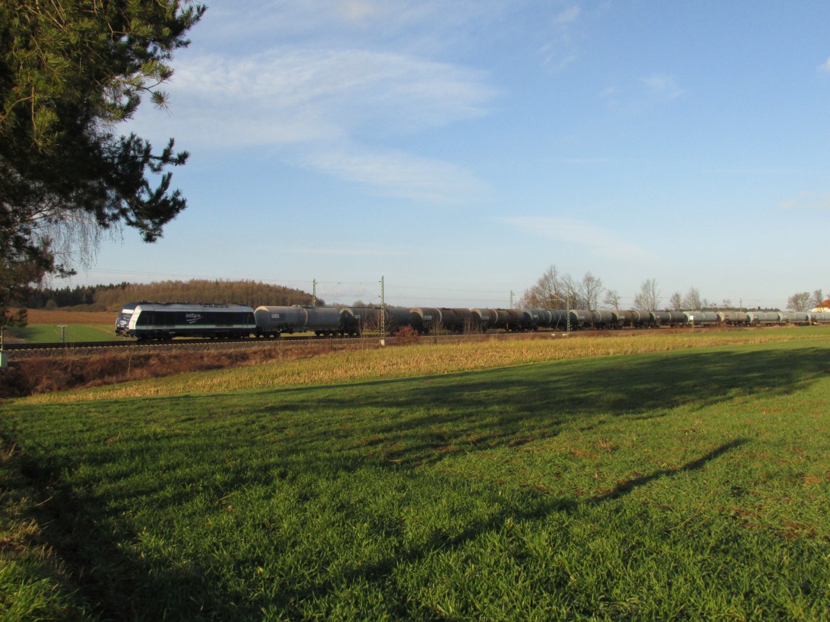 Containerzug von Hof gen Norden hier bei Plauen. Von der Sonne angestrahlt wurde die E 186 147-5 von Railpool am 16.02.2015.