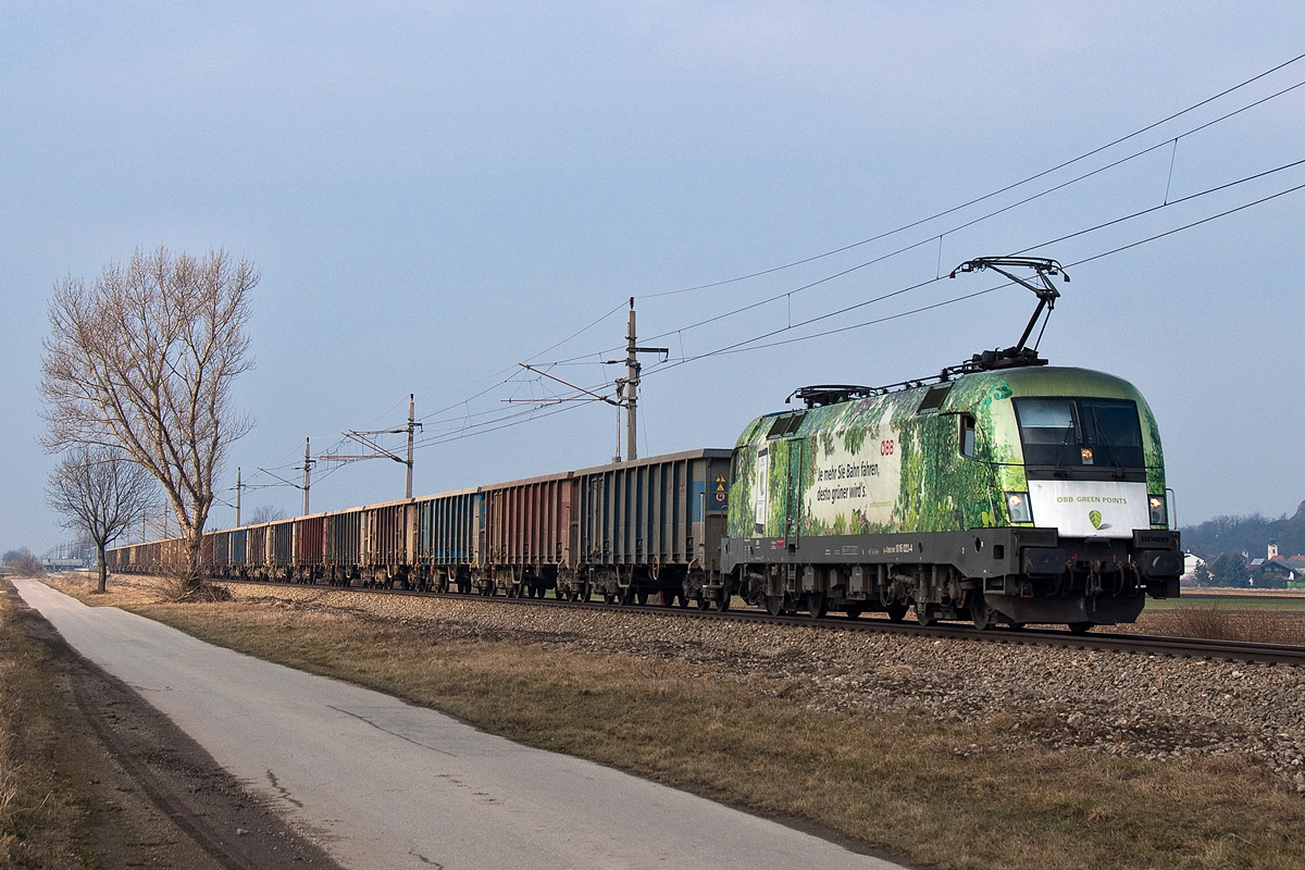 1016 023 "green point" war am 15.02.2015 mit leeren Rübenwagen von Tulln nach Stockerau unterwegs. Die Aufnahme entstand kurz nach Gaisruck.