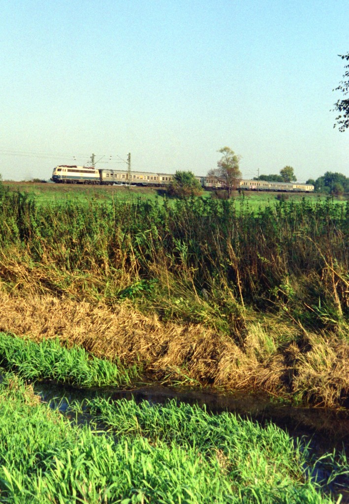 110 xxx mit RE 3220 (Uelzen–Hamburg Hbf) am 10.10.1995 zwischen Winsen (Luhe) und Ashausen