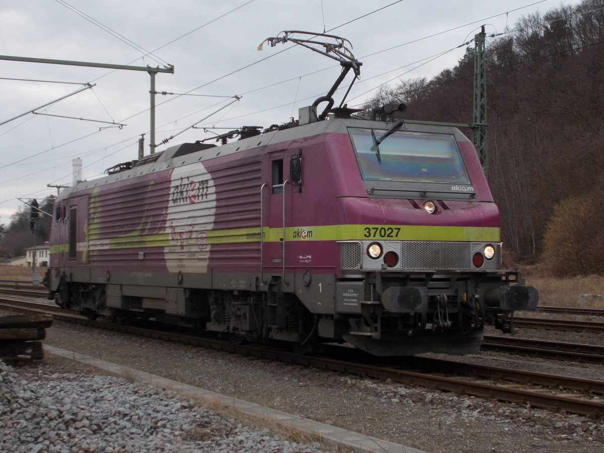 Auf dem Überholgleis fuhr die Akiem 37027,am 21.Februar 2015,in den Bahnhof Lietzow ein und mußte hier einen Halt einlegen.