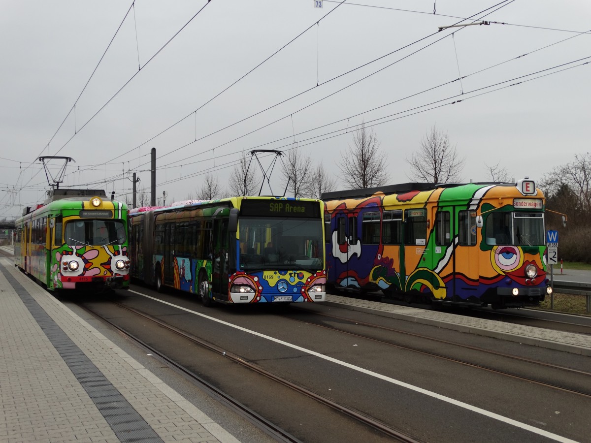 Am 22.02.15 fand wieder mal eine IGN Sondefahrt statt. Dieses Jahr das Moto Carsten Kruse Fahrzeuge. Das ist der Künstler der die Wagen 4115 und 204 und den Bus 8169 bemalt hat. Hier die drei Fahrzeuge in Mannheim an der SAP Arena