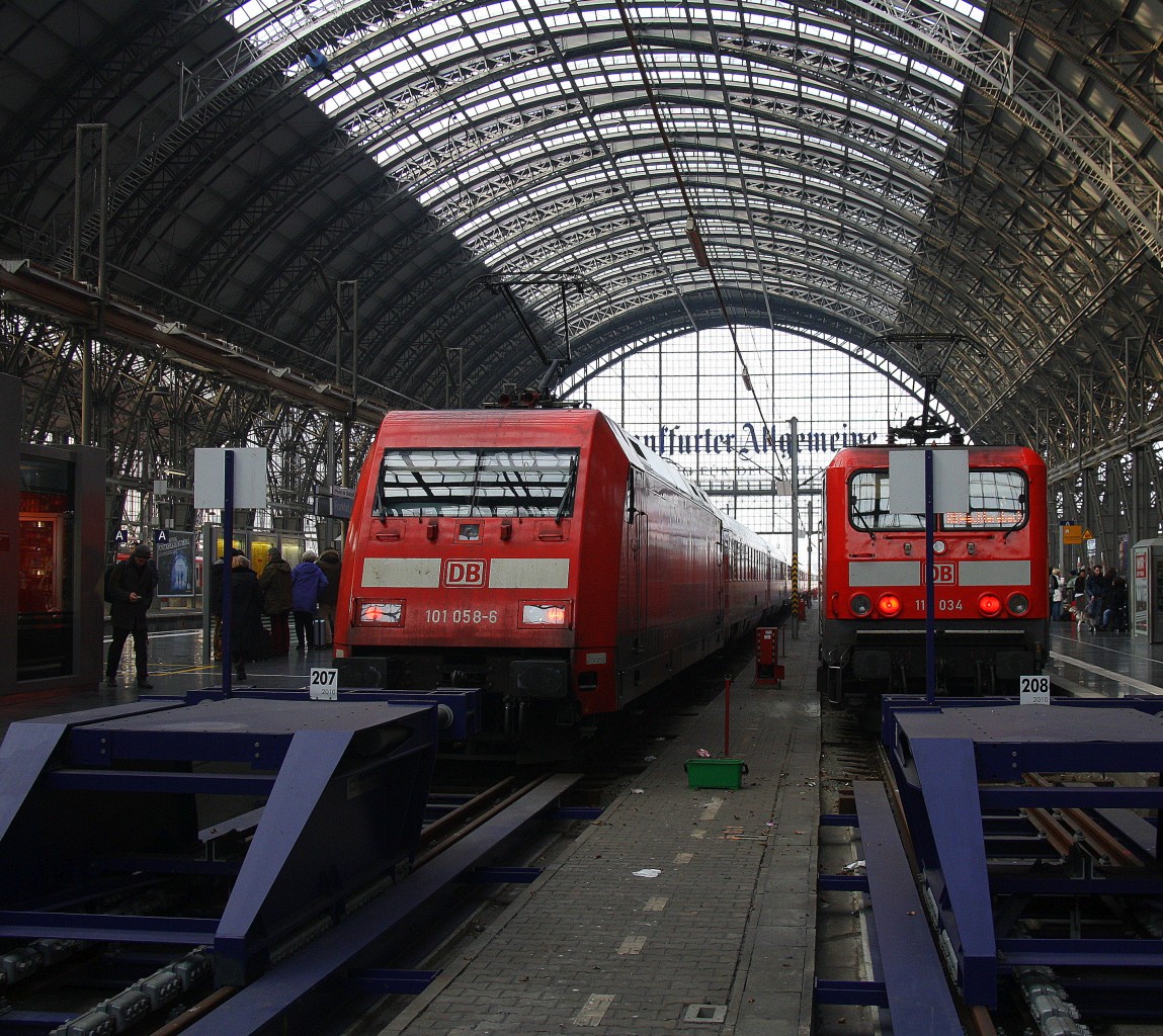 Ein Blick auf die 101 058-6 DB mit einem IC 2226 von Passau-Hbf nach Kiel-Hbf steht im Frankfurter-am-Main-Hbf auf Gleis 6 und daneben steht eine 114 034 DB mit einem RB50 von Frankfurt(Main)Hbf nach Wächtersbach am Kalten Morgen vom 20.2.2015.