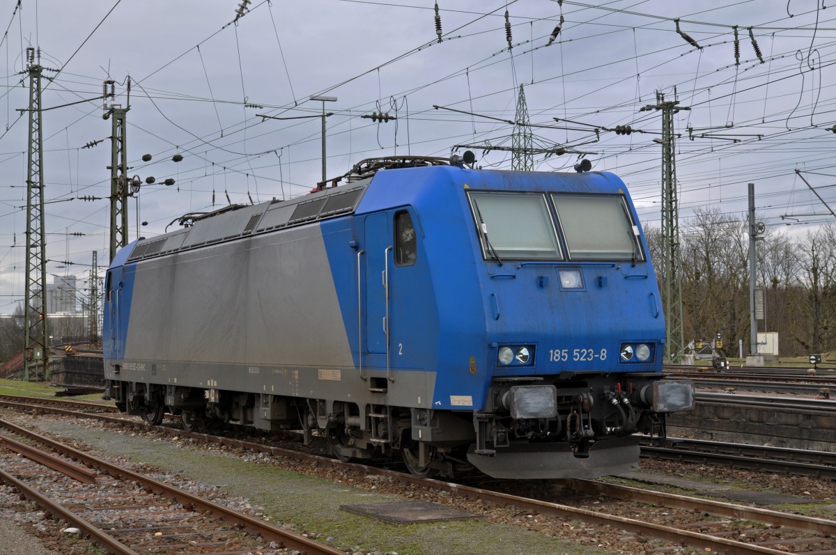 Lok 185 523-8 ist beim Badischen Bahnhof abgestellt. Die Aufnahme stammt vom 28.01.2015.