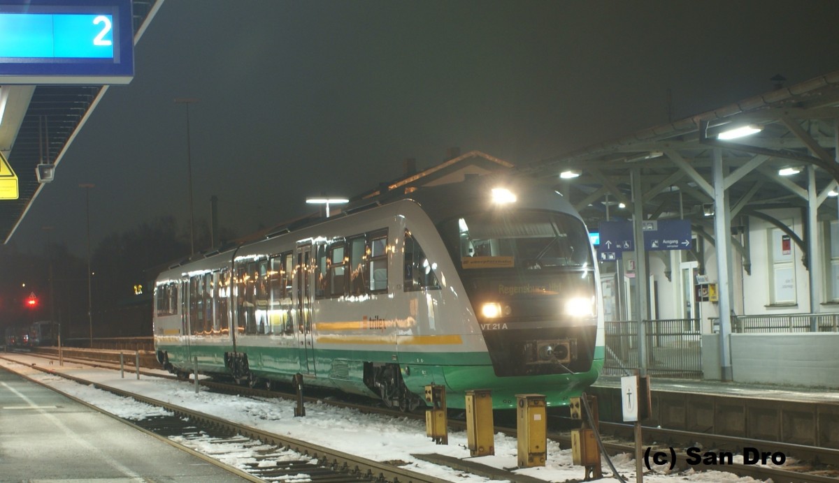 Trilex Desiro VT21 ehm. VBG als Ersatzfahrzeug der Oberpfalzbahn wärt auf seine abfahrt nach Regensburg Hbf in Marktredwitz. 12.02.2015