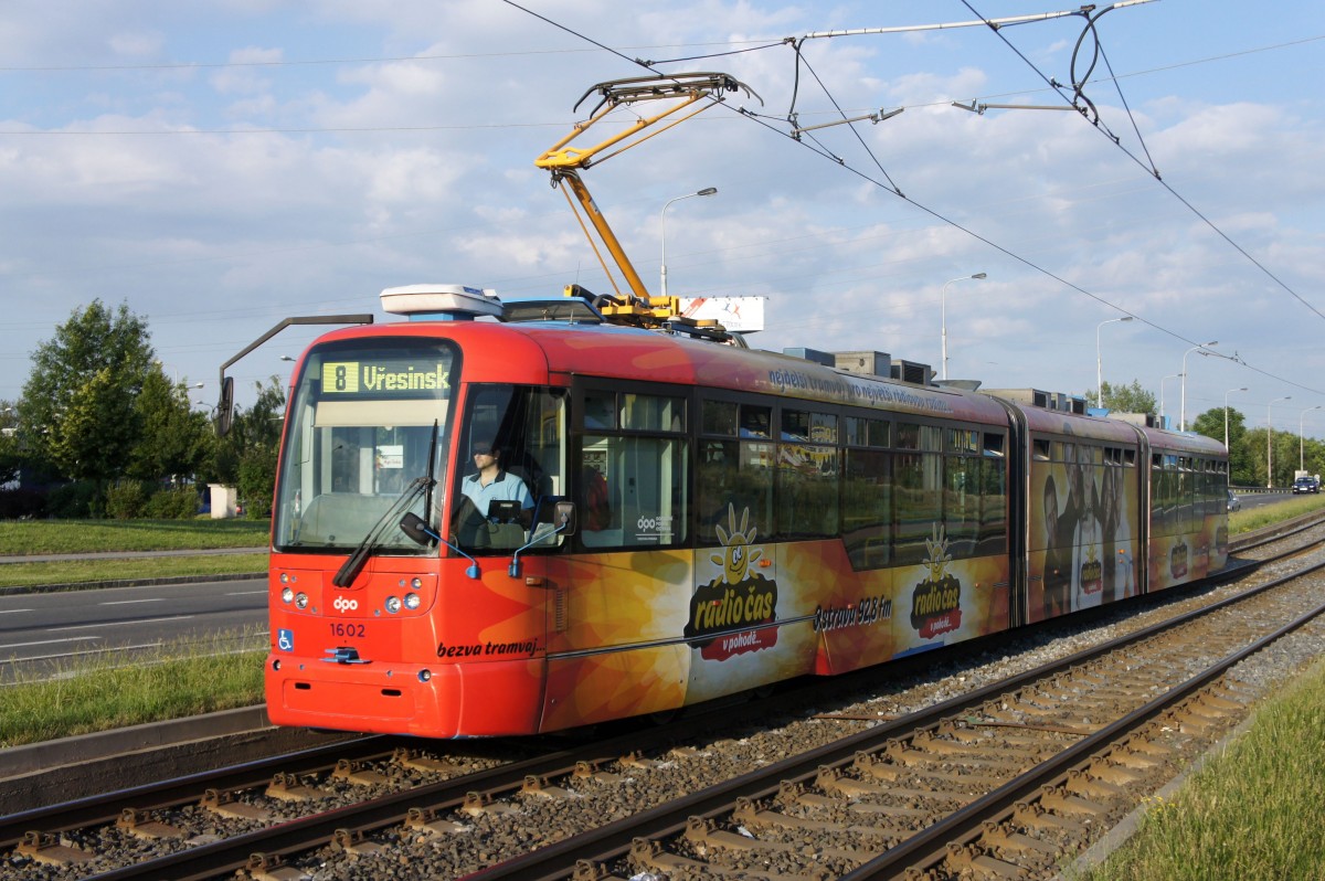 Tschechische Republik / Straßenbahn Ostrava: Vario LF3.E - Wagennummer 1602 ...aufgenommen im Juni 2014 an der Haltestelle "Zahrádky" in Ostrava.