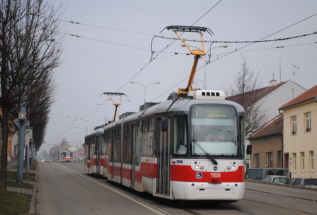 Der nicht modernisierte K2 1123 ist als Verstärkerzug der Linie 6 in der Videnska ulica bei der Haltestelle Celni in Richtung Bohunice Smermova unterwegs.(20.02.2015)