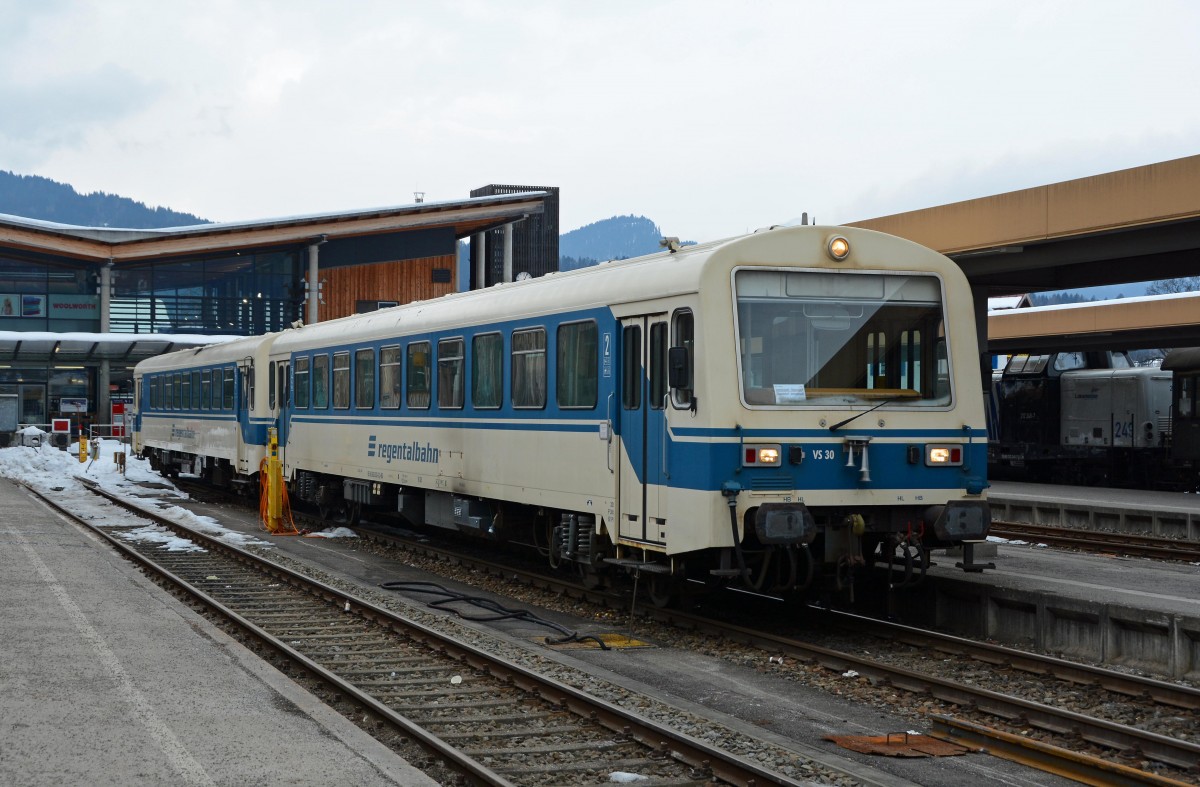 VS 30 Steuerwagen mit VT 02 Triebwagen der Bauart NE 81 steht mit dem ALX 29333 Abfahrbereit im Bahnhof Oberstdorf am 21.2.2015.
