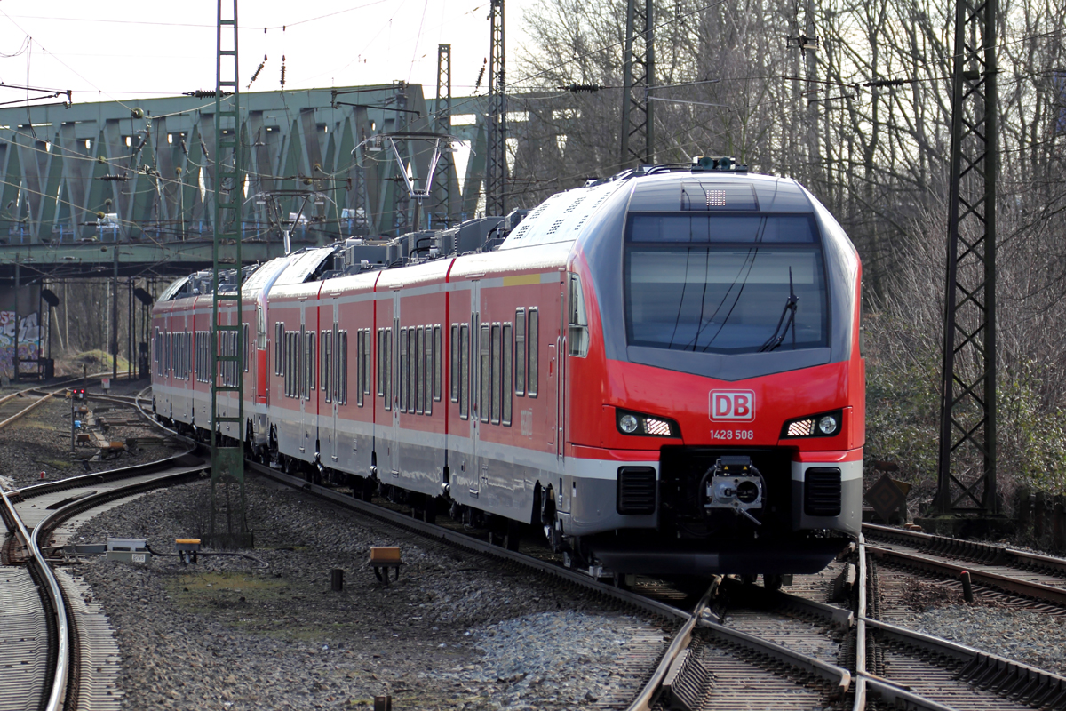 Die Fußgängerbrücke in Berlin Karlshorst überquert die Treskowallee und liegt zwischen den S-Bahn-Gleisen. Hier verlässt ein Zug, der laut DB-App ausgefallen ist, den Bahnhof Karlshorst in Richtung Ostkreuz. 28.2.2015