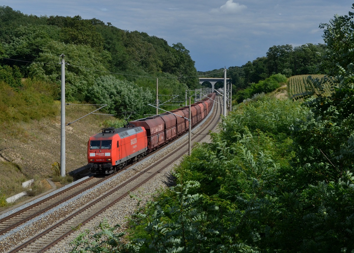 145 054 mit einem Kohlezug am 27.08.2014 bei Frankfurt-Rosengarten.
